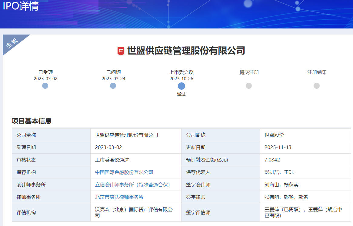 上证报中国证券网讯 11月13日,深交所官网显示,世盟供应链管理股份有限公司(简称“世盟股份”)于11月13日更新提交相关财务资料。